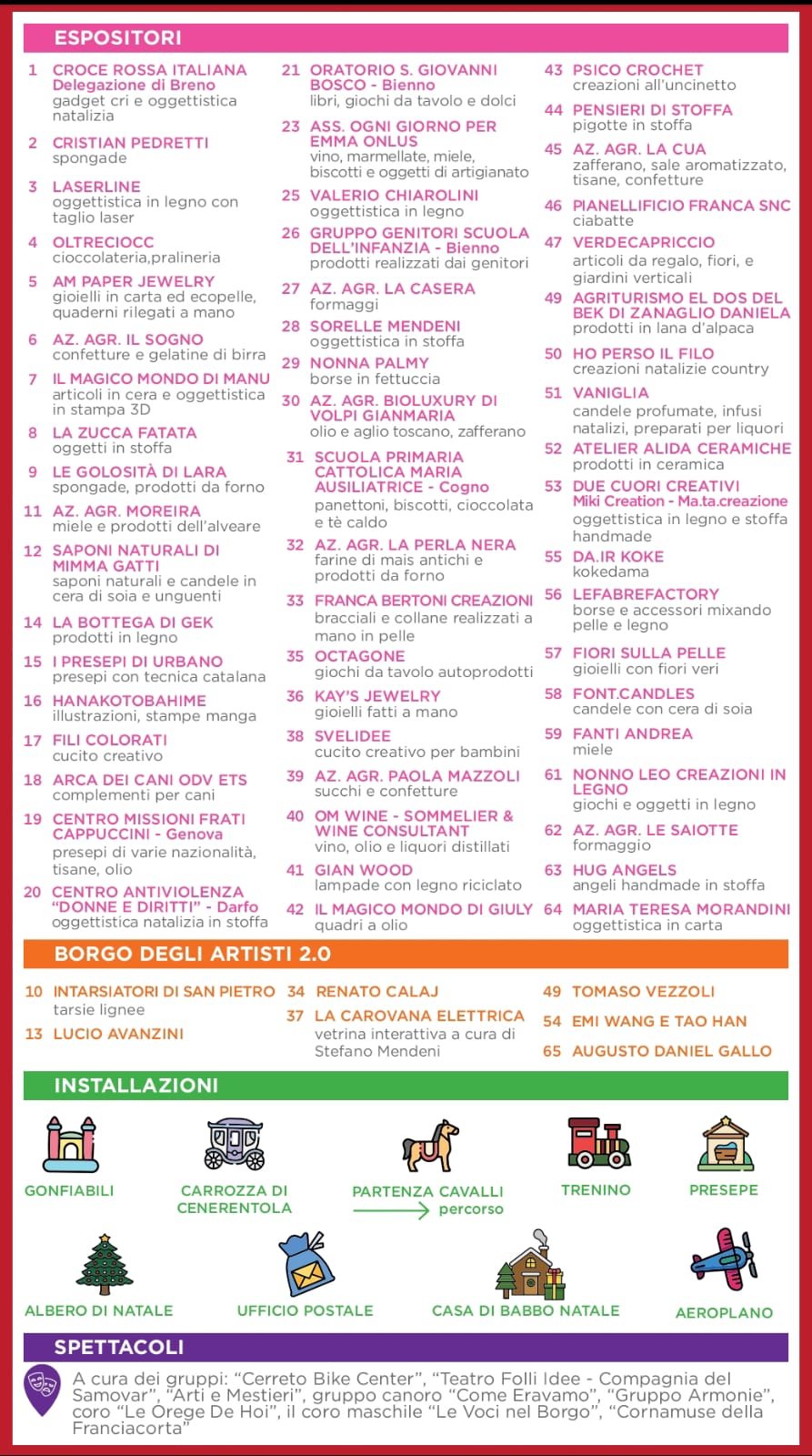 Tra le vie e le piazzette riecheggeranno le dolci melodie degli zampognari, mentre spettacoli itineranti, performance artistiche e teatrali animeranno il borgo in un’atmosfera da sogno. I più piccoli potranno incontrare i personaggi delle favole, vivere momenti magici e scattare foto indimenticabili.